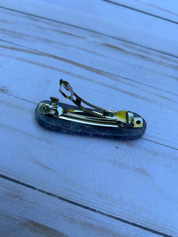 This elegant barrette is about 3-1/4" long and 3/4" wide. The french style clip is 3 inches long. The textured blend of glass glistens and is much more impressive in real life than photographs can show. It would make a lovely gift. The barrette comes shipped in padded bubble wrap for safety and a nice gift bag.