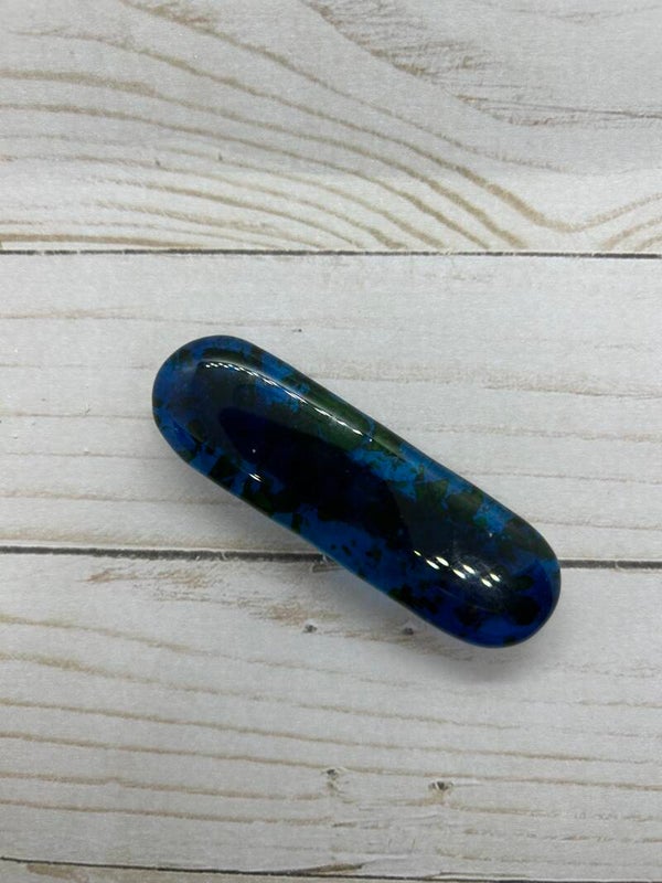 This is a gorgeous, unique barrette. The mixed blue colors make the glass sparkle with a textured, deep blue shade. It is securely attached to a quality French barrette base. The glass measures approximately 3.25". The barrette base measures approximately 3" from end to end. Very pretty!